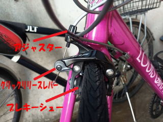 キャリパーブレーキの各名称です 調整に必要なのはアジャスター ブレキーシューが削れて減ってきたら 取り合えずアジャスターで 調整していきます |